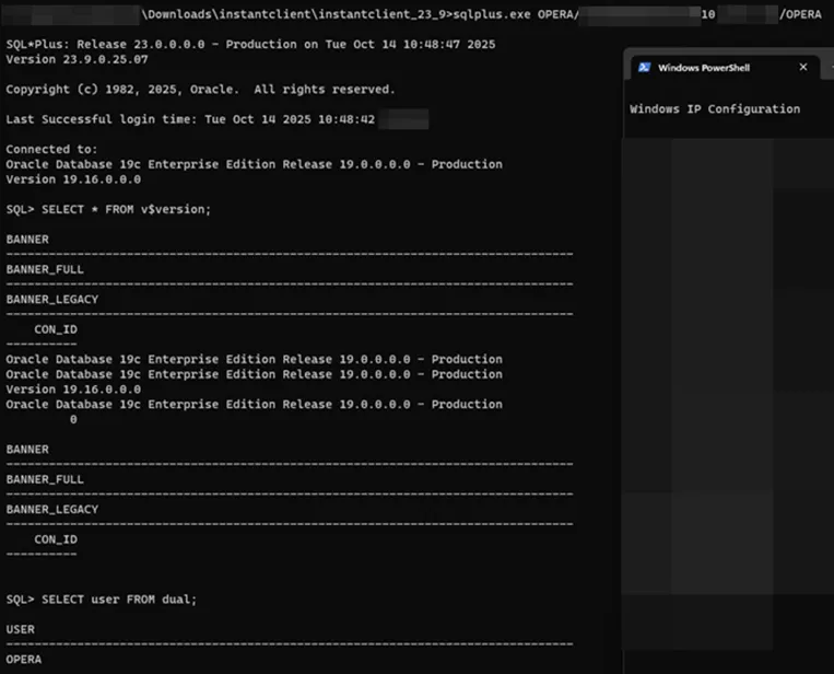 We verified these credentials by enumerating the OPERA database host and connecting with sqlplus, an SQL client for Oracle Database. A few seconds later, we’re in!
