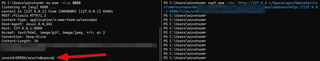 Figure 5. Left: Attacker-controlled server which receives the SSRF request. Credentials are disclosed in the dbuser/dbpswd@dbschema format. Such hospitality! Right: The crafted request was sent through curl.