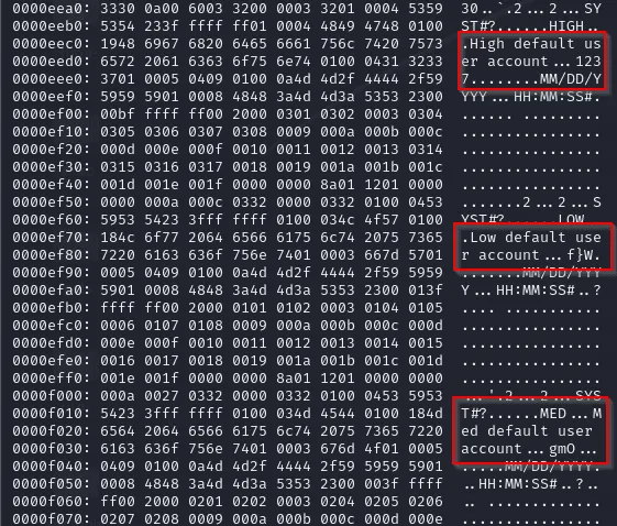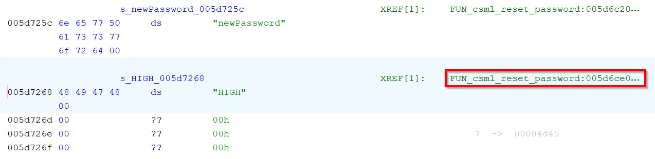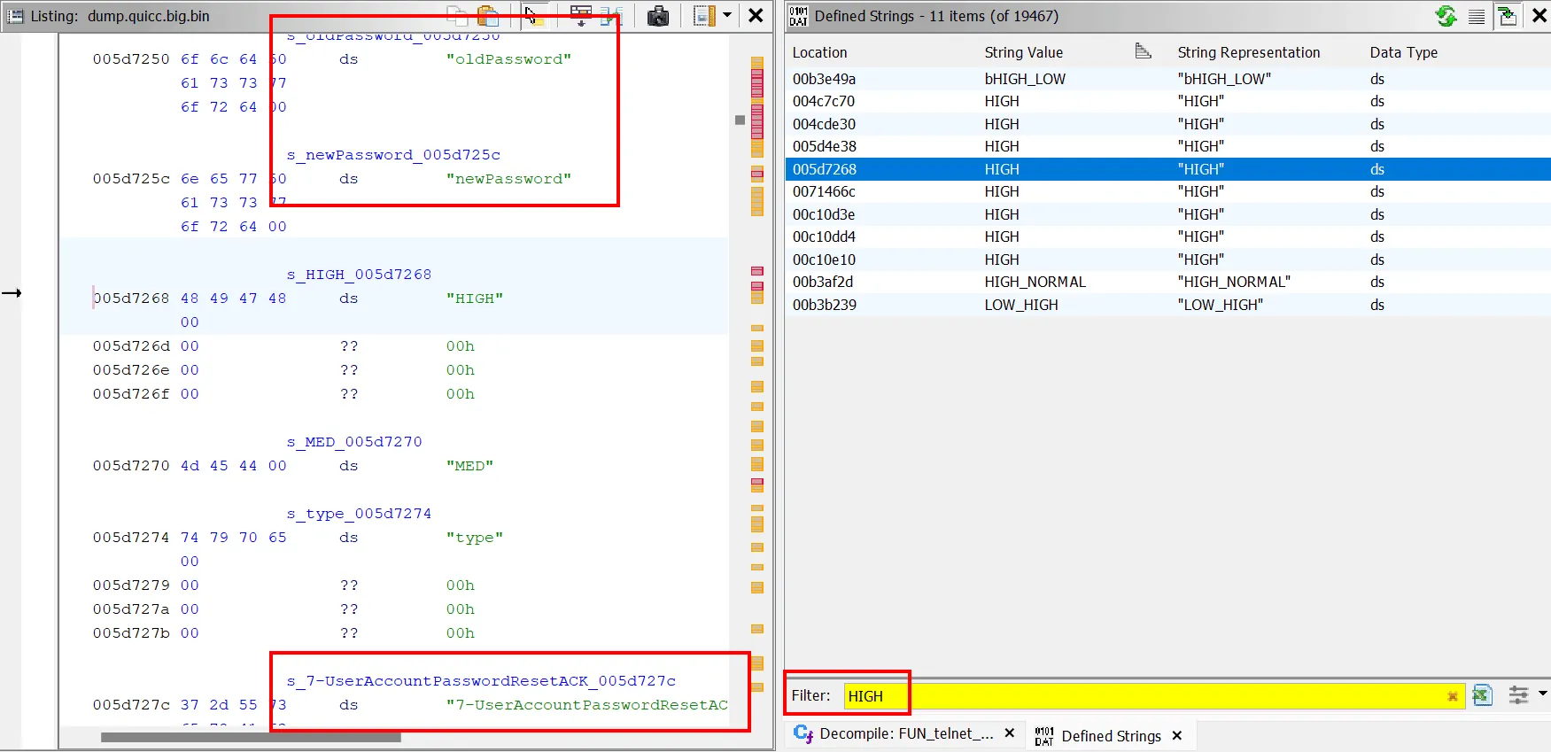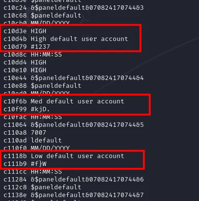 We started by again, searching for common phrases associated with login. This time we tried searching for one of the default users: HIGH. In one instance, the string was embedded among other strings such as "newPassword", "oldPassword", and "UserAccountPasswordReset" which suggests some kind of password-related activity.