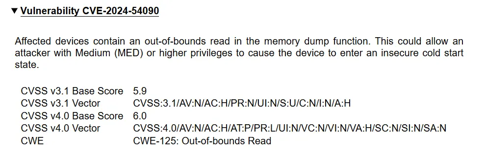 CVE-2024-54089– Weak Encryption Mechanism Vulnerability in Siemens Apogee PXC and Talon TC DevicesCVE-2024-54090– Out-of-Bounds Read Vulnerability in Siemens Apogee PXC and Talon TC DevicesCVE-2025-40757– Information Disclosure Vulnerability in Siemens Apogee PXC and Talon TC Devices