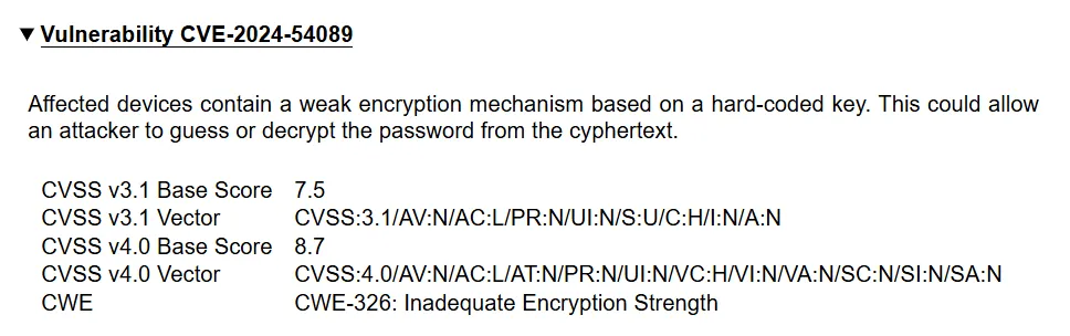 This leads us to our second finding, CVE-2024-54089; a weak password encryption mechanism. At this point, it was confirmed an attacker could guess certain passwords.