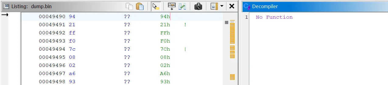 While strings and od can provide clues, they do so without much context. We loaded the entire 64MB memory dump into Ghidra and were greeted with this marvellous junk: