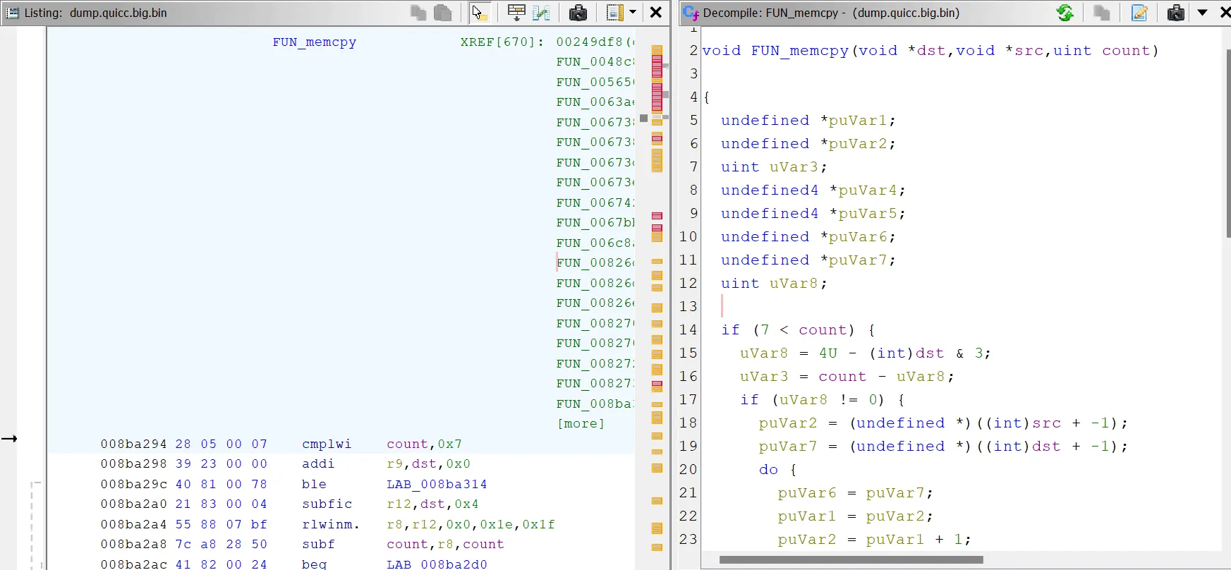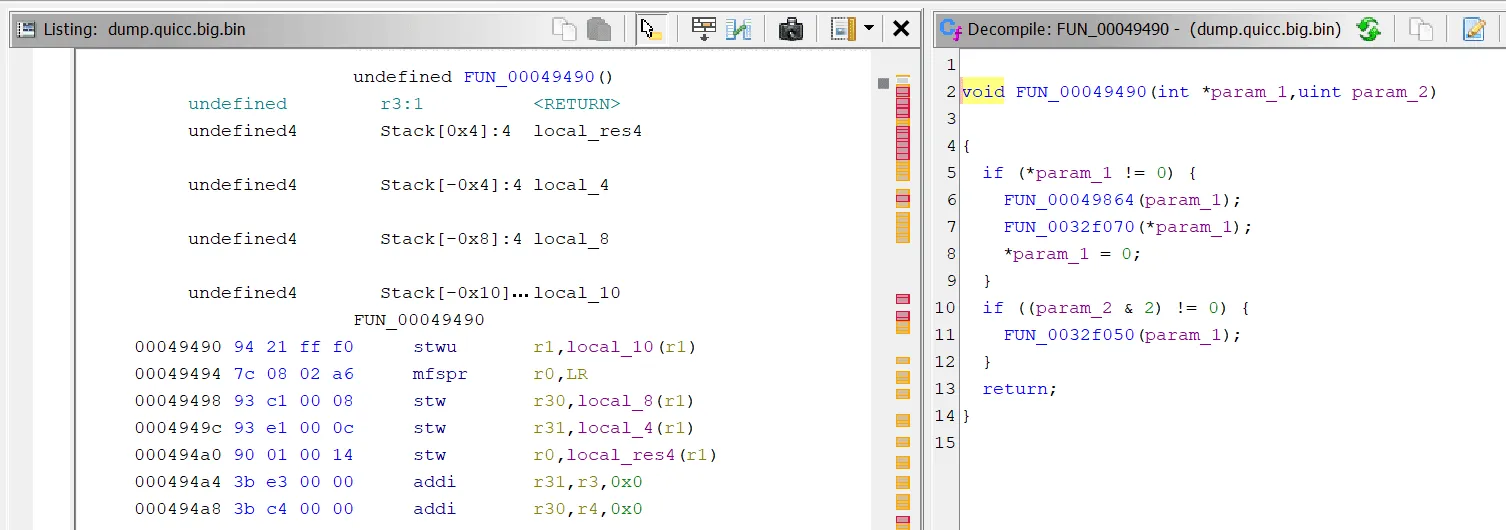 It is important to caveat that we did not have the firmware for this controller, nor was Ghidra MCP available at the time, so our testing was very much black box. Further, we faced several roadblocks: 1) All symbols, libc or otherwise, needed to be reversed manually. 2) Ghidra flow detection is a bit buggy with PowerPC. 3) Code may be incomplete, since it may be overwritten with data or loaded dynamically.