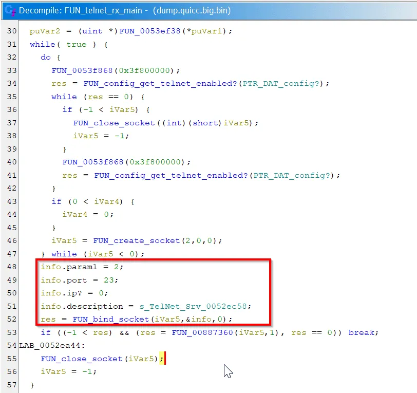 By correlating strings and the number 23 (the default telnet port), we determined functions relevant to socket programming.