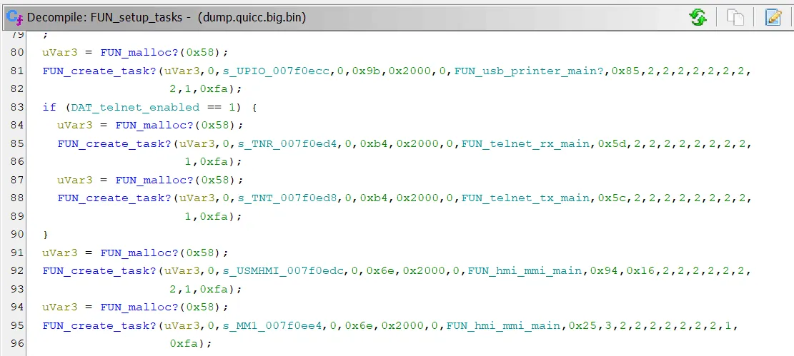 We tried finding the encryption function through different approaches. While noodling around, we came across the thread function running the telnet server (think: the main function / entrypoint of the thread). We were unable to proceed in drilling down to our target (shakes fist— curse you indirection!), but this still posed a good opportunity to observe how the PLC works at the embedded level, and to revisit concepts of embedded software.