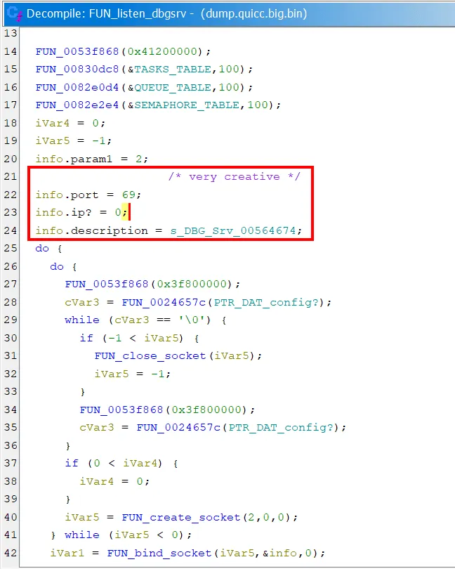 Once in a while, we come across interesting bits and pieces. As a side quest, we took a peek at the other thread functions, and uncovered the code for a debug server with a peculiar choice of port…