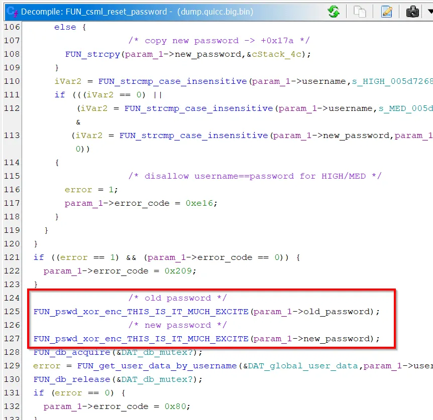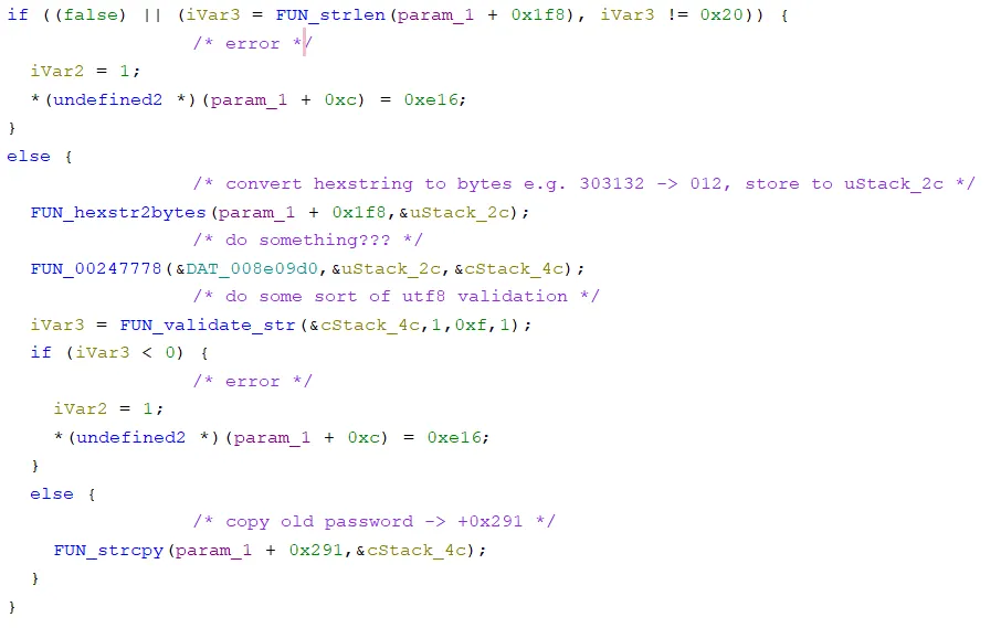 Inside the reset_password function, we identified two similar code flows which operate on the old password and new password. In the screenshot below, the old password is converted to bytes and validated before being copied into the buffer at param_1 + 0x291. Later on, the same process is applied to the new password which is copied to param_1 + 0x17a.