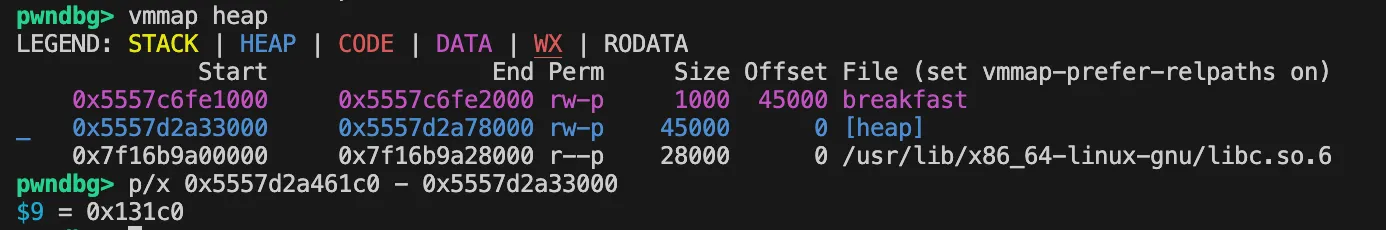 ) This allows us to calculate offsets to gadgets. - Find a heap address. (