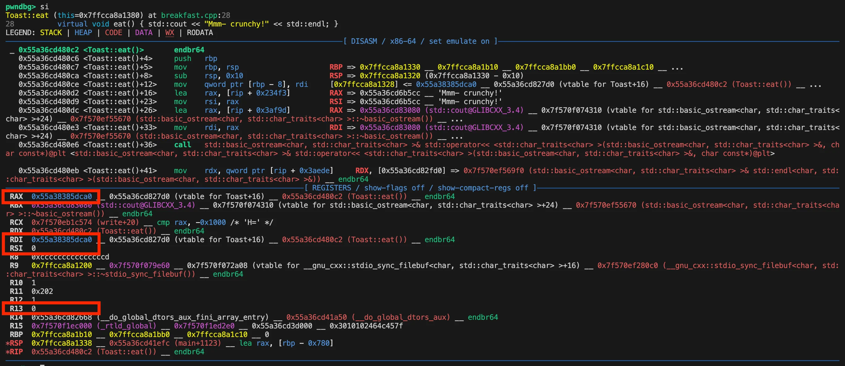 Disassembly and registers upon reaching Toast::eat()
